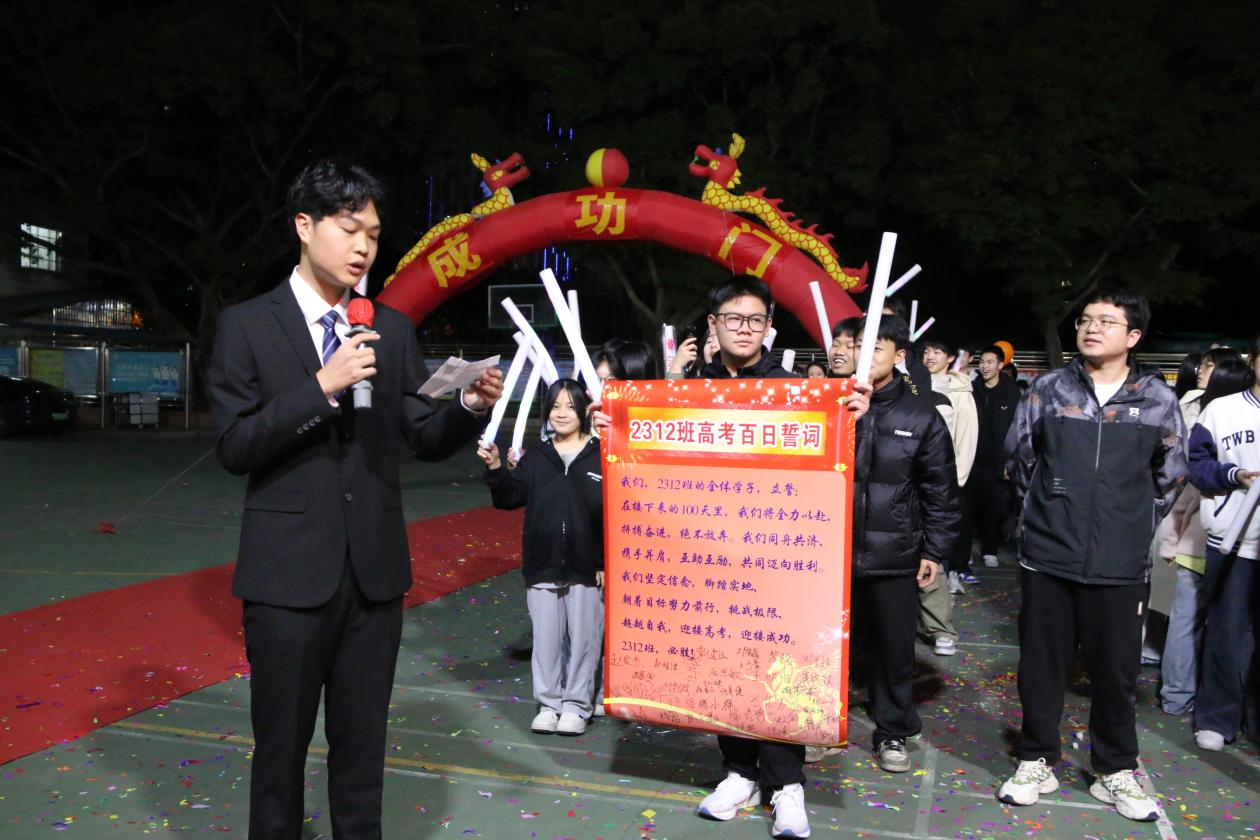 走完红毯,高三同学们以班为单位在操场上宣读百日誓师誓词。"摈弃杂念,专注当下;不畏艰难,迎难而上;争分夺秒,全力以赴!",“朝着目标努力前行,挑战极限,超越自我,迎接高考,迎接成功!”同学们的铮铮誓言响彻校园。
